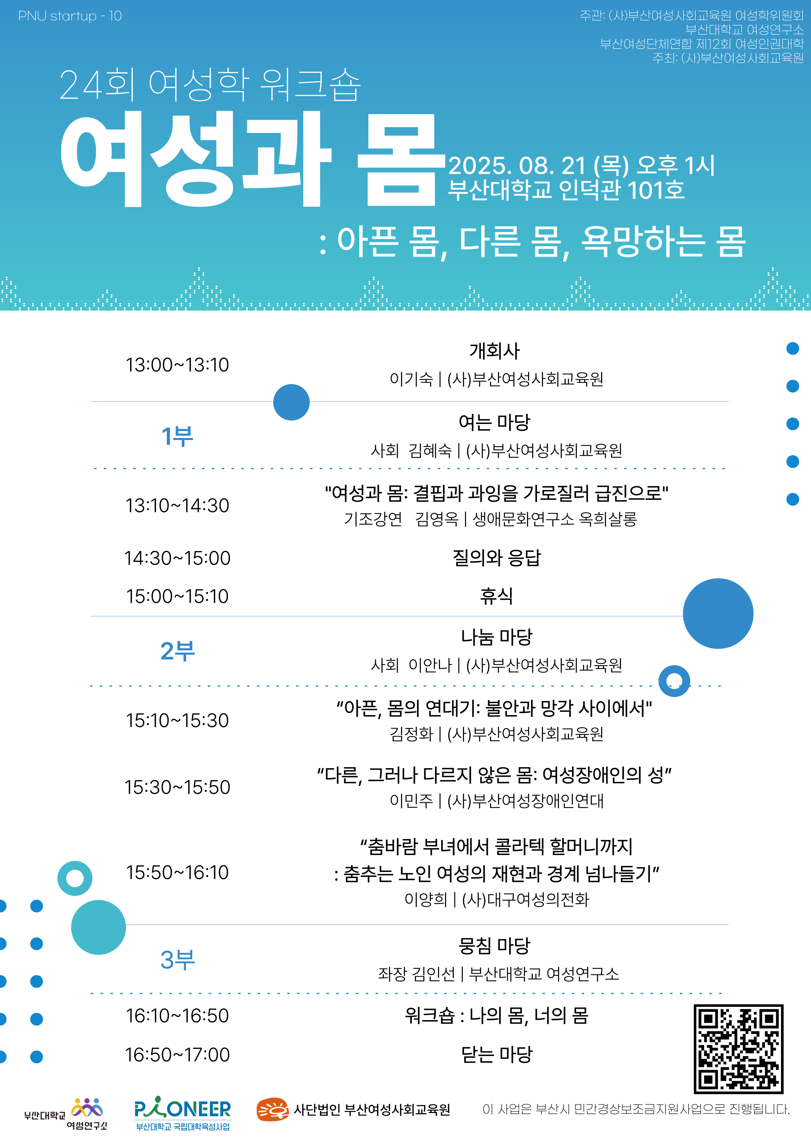 부산대학교 여성연구소에서는 사단법인 부산여성사회교육원과 더불어 <제24회 여성학 워크숍 - 여성과 몸>을 개최했습니다.