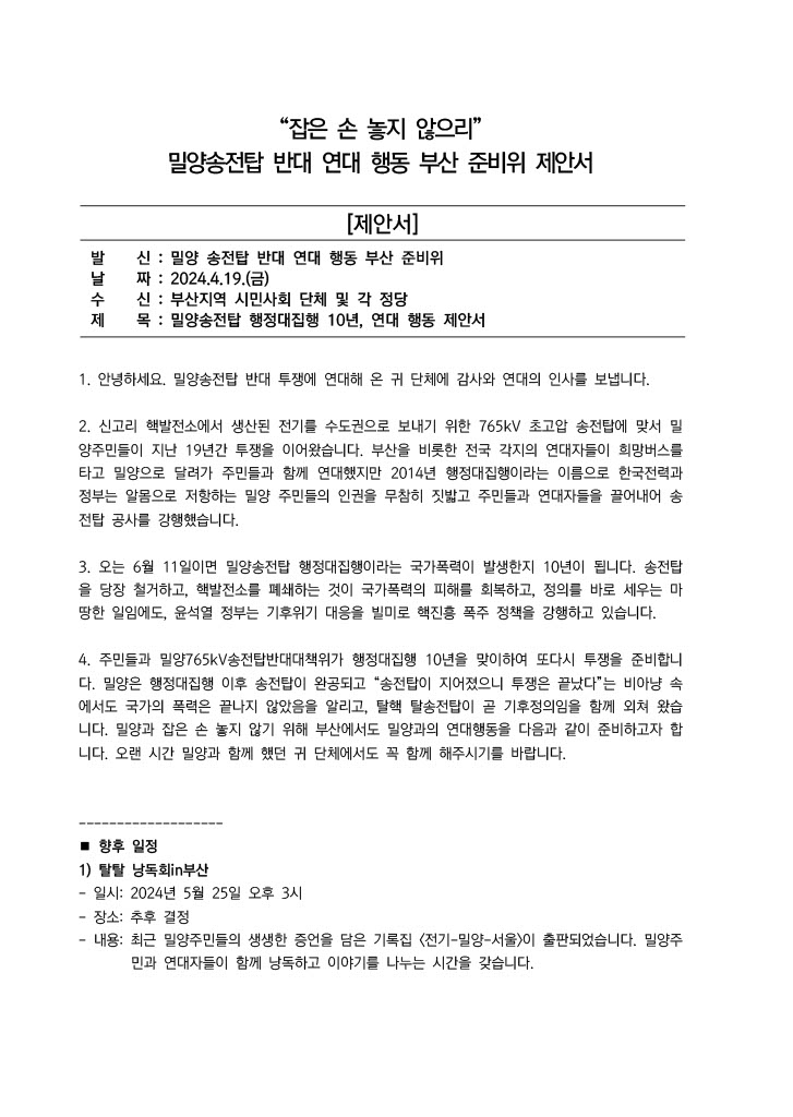 <밀양 송전탑 반대 연대 행동 부산 준비위 제안서>