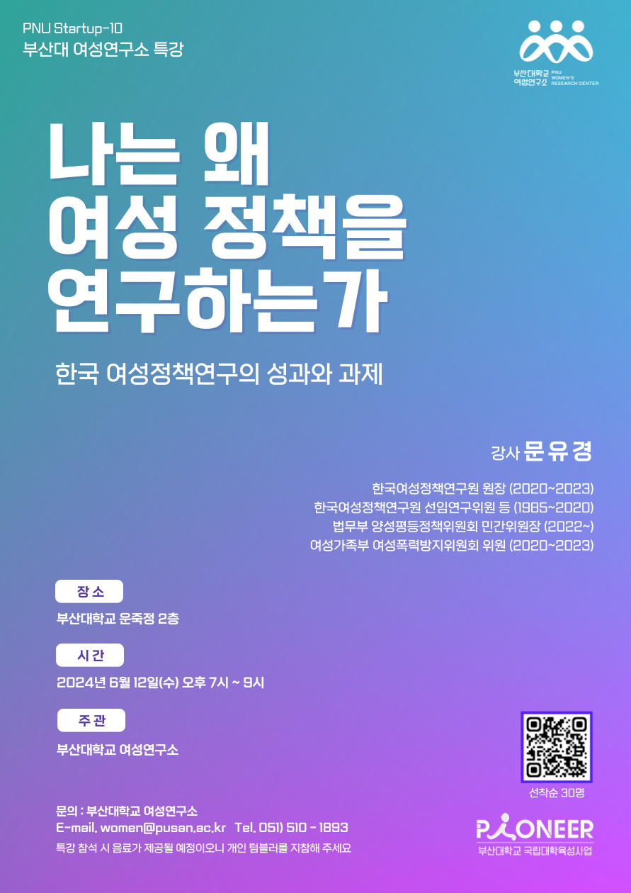 [부산대 여성연구소] 2024 특강 - '나는 왜 여성 정책을 연구하는가' 개최 안내