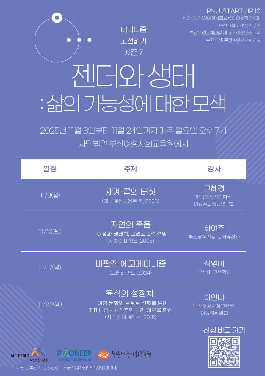 부산대학교 여성연구소에서는 2025년 11월 3일부터 11월 24일까지 매주 월요일 오후 7시 시민강좌를 개최합니다.
